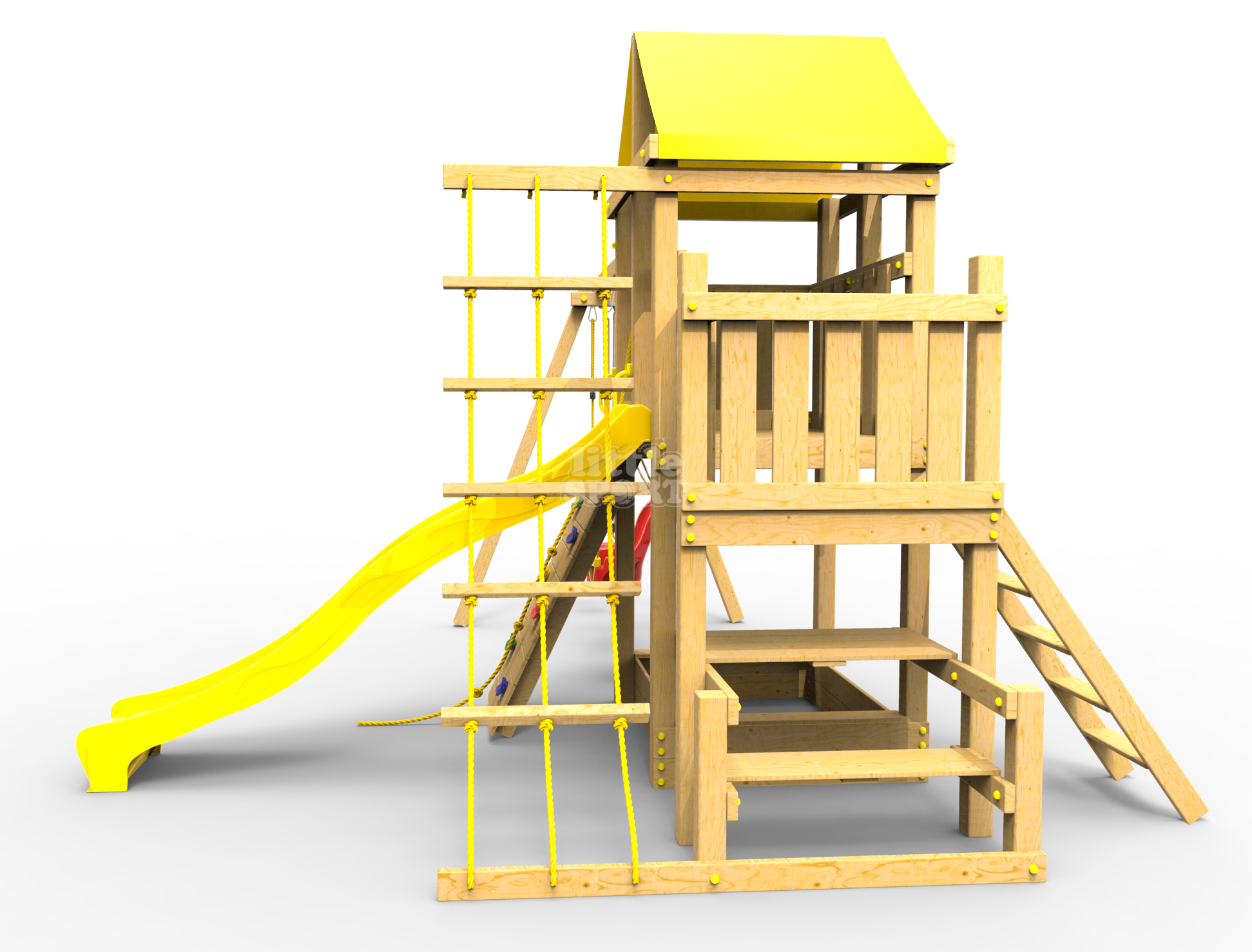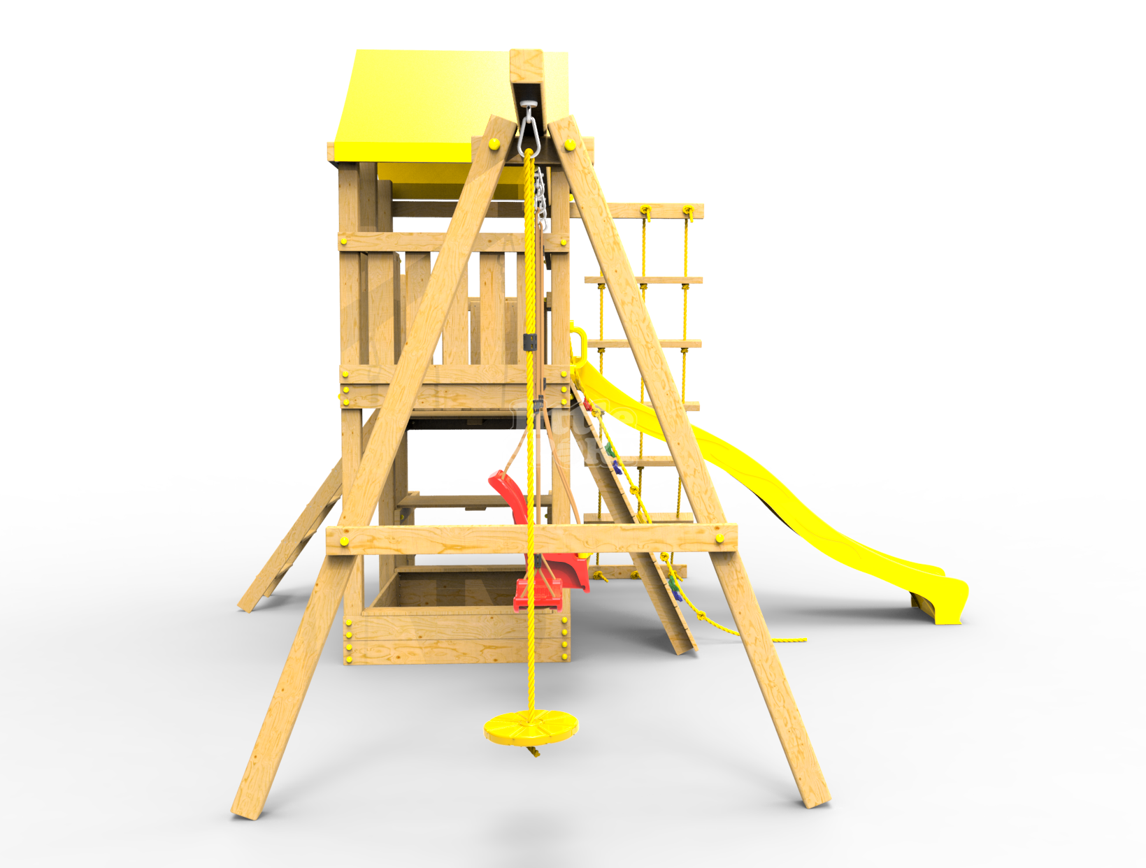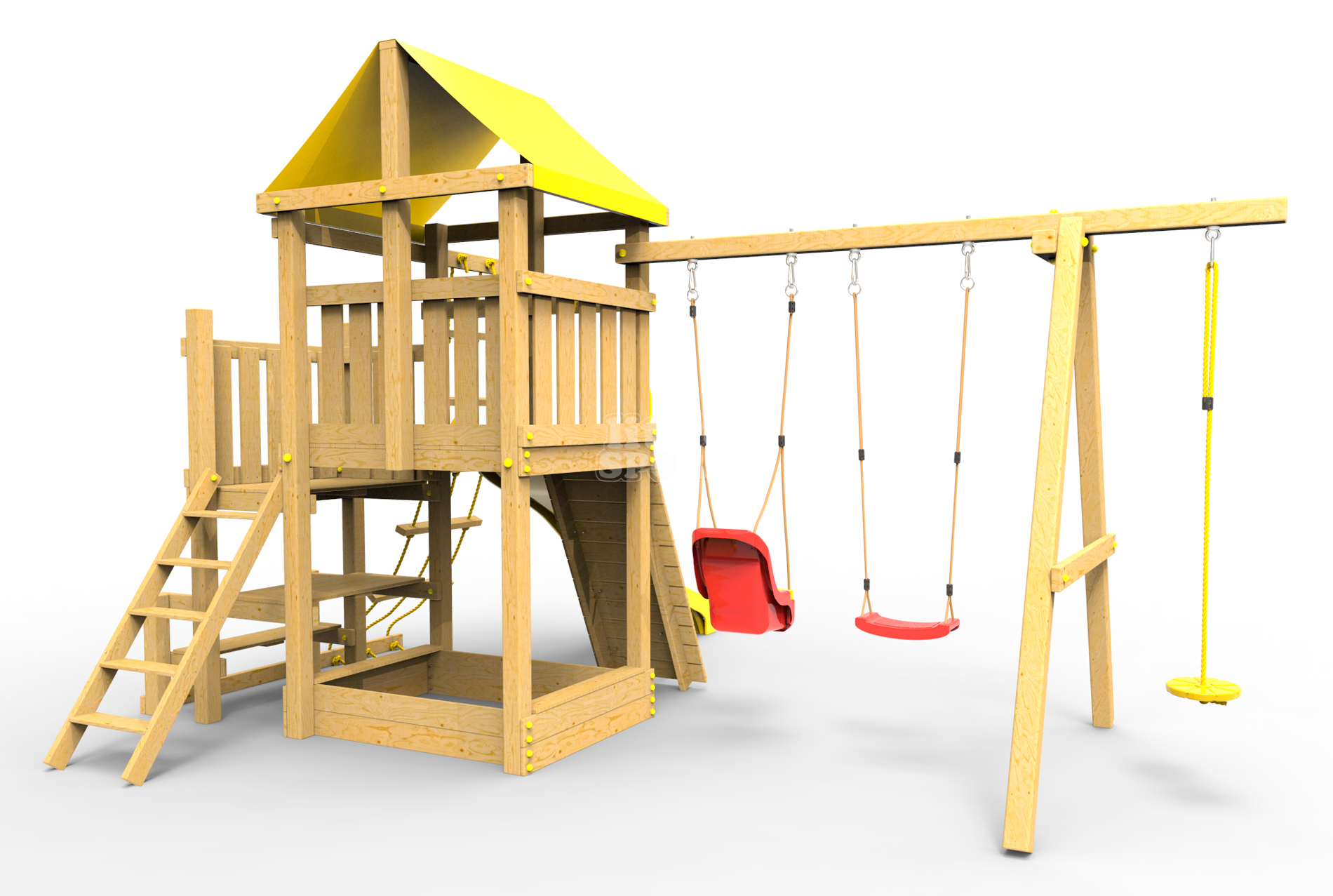 ● деревянная крыша ● трап 2м с канатом ● поручни для лестницы ● диван на цепях двухместный ● столик в песочницу
