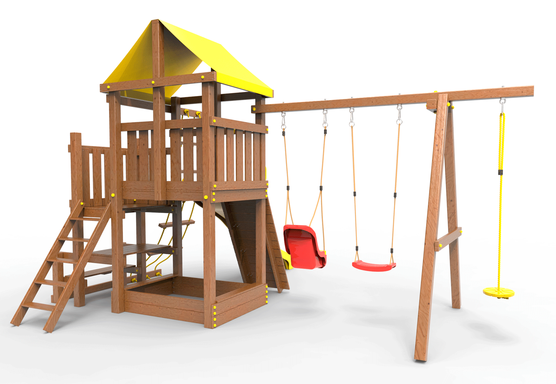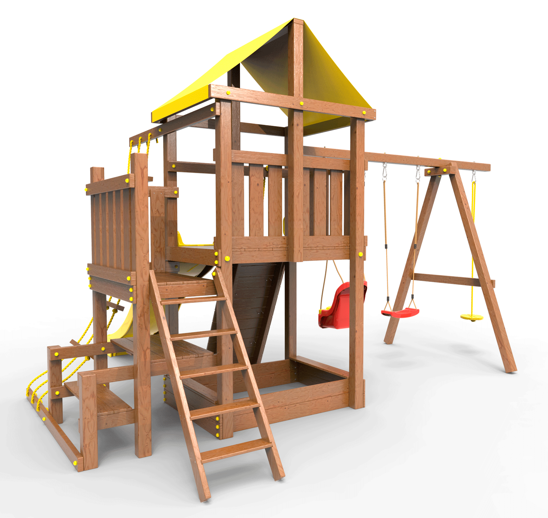 ● деревянная крыша ● трап 2м с канатом ● поручни для лестницы ● диван на цепях двухместный ● столик в песочницу