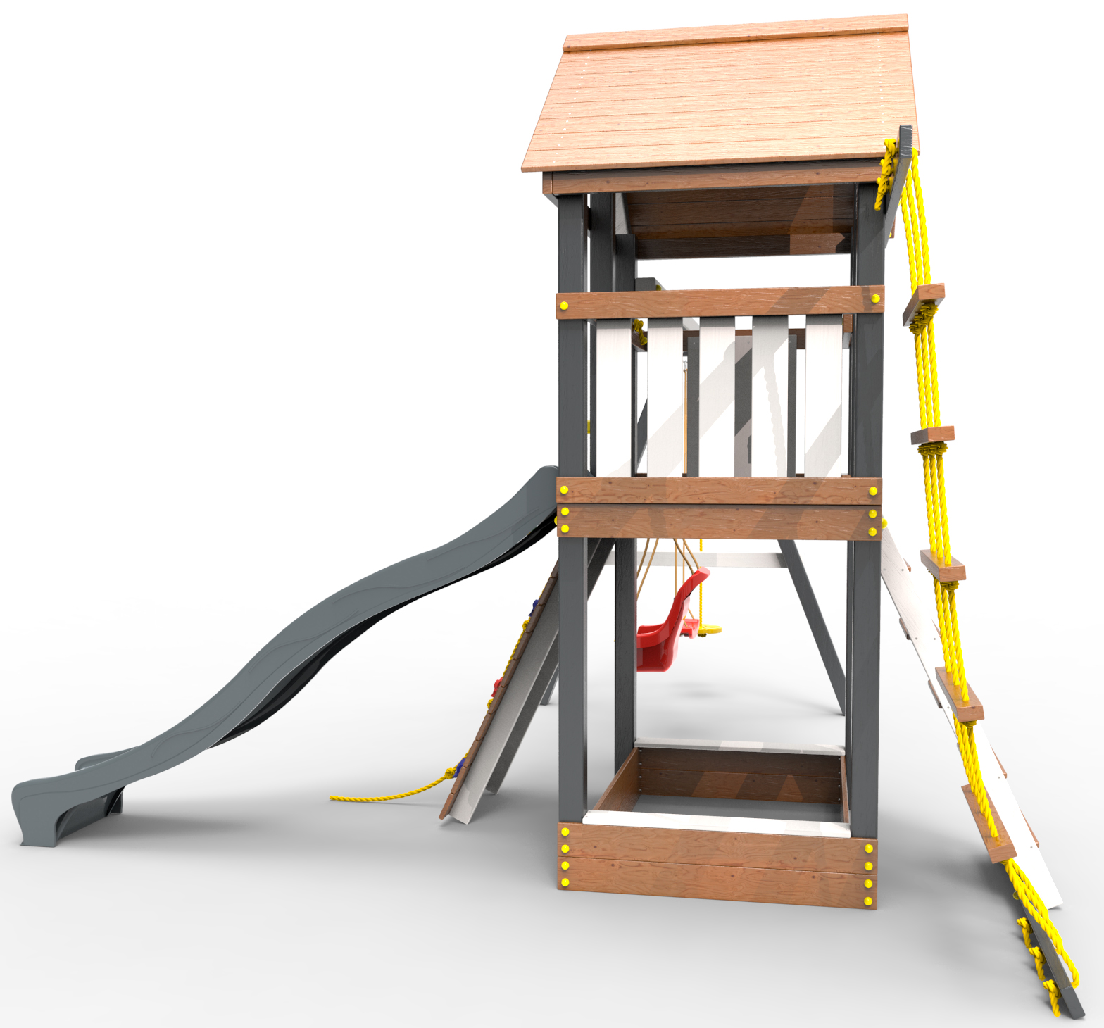 Детская площадка «Пикник Ультра 2.3 » является одной из вариантов комплектации флагманской модели "Ультра" и представляет собой двухуровневую конструкцию, на первом уровне которой расположена песочница, а второй этаж представляет собой игровое пространство под деревянной крышей. Конструкция оснащена качельной балкой, повышенной прочности, которая имеет 5 креплений для качелей или любого другого навесного оборудования, шторм-трапом ,горкой и скалодромом! .