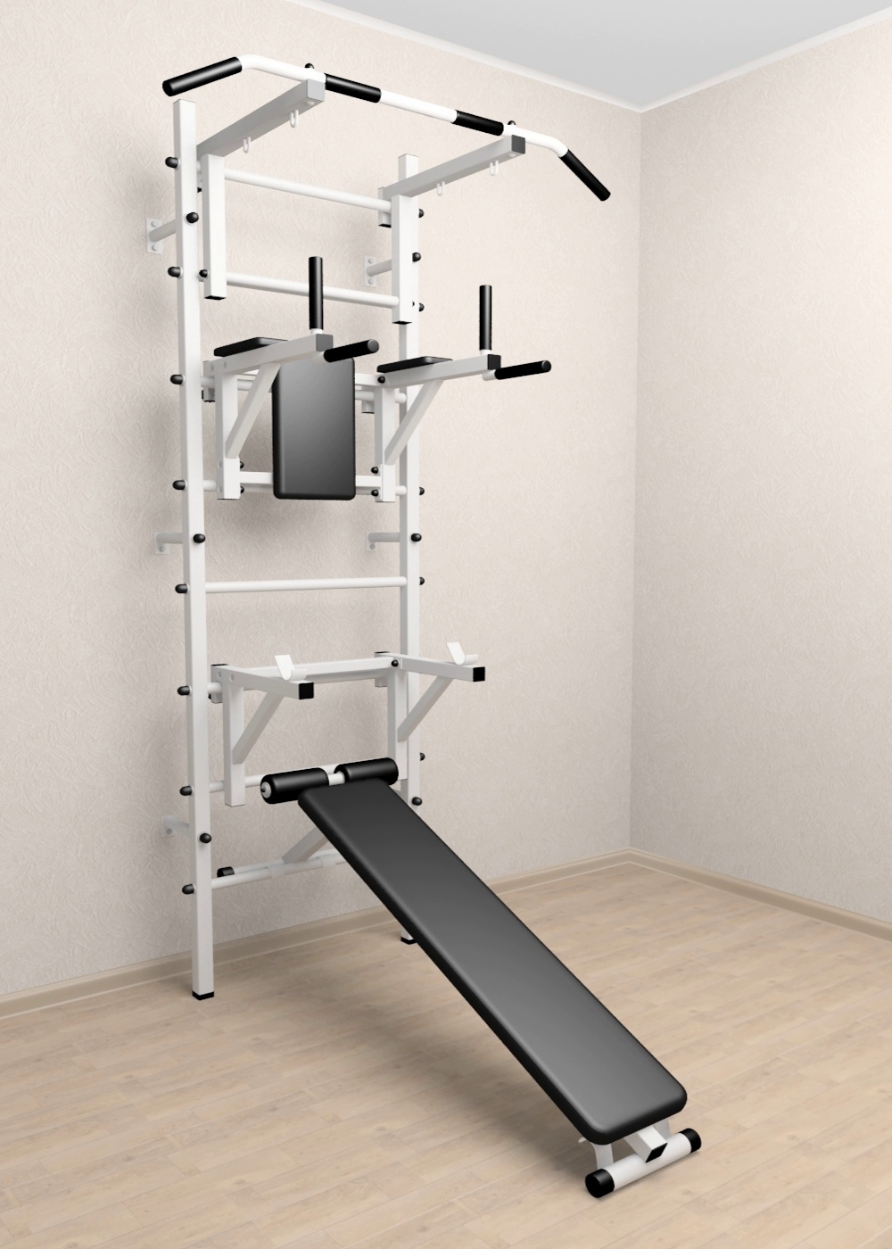 Стойки шведской стенки Sv Sport усиленные изготовлены из профильной трубы 60 х 40 х 2 мм. Ступени изготовлены из круглой, стальной трубы, покрытой резиной (не скользят, не натирают мозоли, не прокручиваются, не имеют запаха, приятны на ощупь). Устанавливается к стене при помощи 6 кронштейнов. На перекладину, в местах хватов, одеты резиновые ручки.